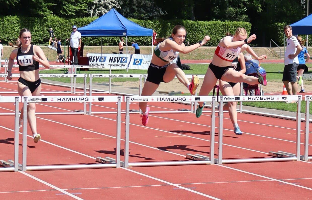 Das klappte in Hamburg am Tag danach wesentlich besser. Am besten lief es für Laura Krüger, die bei 2 Starts über 100 m Hürden und 100 m flach in der U20 mit 16,26 Sek. und 13,52 Sek. jeweils PB erzielte. Angelina Kisser war mit den reinen Ergebnissen im Dreisprung (10,61 m) und Weitsprung (4,70 m) zwar nicht so ganz zufrieden, aber auch hier deutete sich an, das durchaus mehr geht. Nach längerer Durststrecke feierte Malena Schomaker in der U20 über 400 m ein kleines Comeback. Mit 58,53 Sek. knackte sie bereits die zu diesem Zeitpunkt noch gar nicht eingeplante DM-Norm (58,70 Sek.) und kann für die DM vom 11.-13.7. in Bochum-Wattenscheid fest planen.
