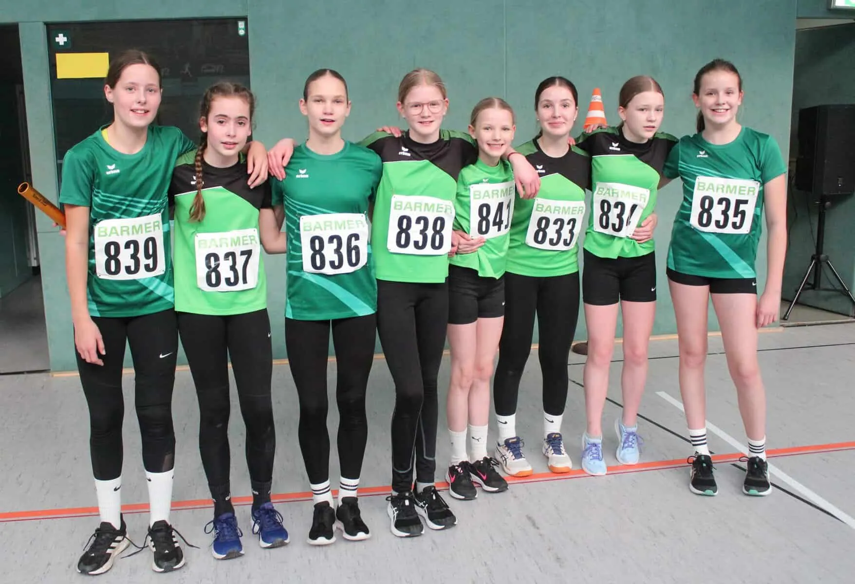 Am 2.3. nahm fast die komplette U14 und dazu 2 Kids aus der U12 am traditionellen Hallensportfest in Löningen teil. Am Ende fuhren wir mit etlichen guten Plätzen, vielen tollen Leistungen, einem richtigen und einem „gefühlten“ ersten Platz nach Hause. Der ging auf das Konto der 4x133m Staffel (1 Runde in der4-fach-Halle) der weiblichen U14. Im 1. Zeitlauf kam unsere 2. Staffel mit Marit Osteresch, Sina Frank, Felica Schomaker und Fenja Lohmann auf Platz 2 (Gesamt 6.) und zeigte schon da, dass sich unser Staffeltraining gelohnt hat. In 2. Lauf lag dann unsere 1. Staffel mit Luisa Kaupa, Luisa Kaltwasser, Paula Freymuth von Beginn an vorn und Schlussläuferin Marie Kofoet baute den Vorsprung noch aus – bis sie vor der letzten Kurve ausrutschte, stürzte, den Staffelstab verlor, den wiederholte, sich aufrappelte, weiterlief und sogar noch 3. (auch insgesamt!) wurde. Wirklich Klasse und deshalb auch „gefühlt“ ein Sieg!