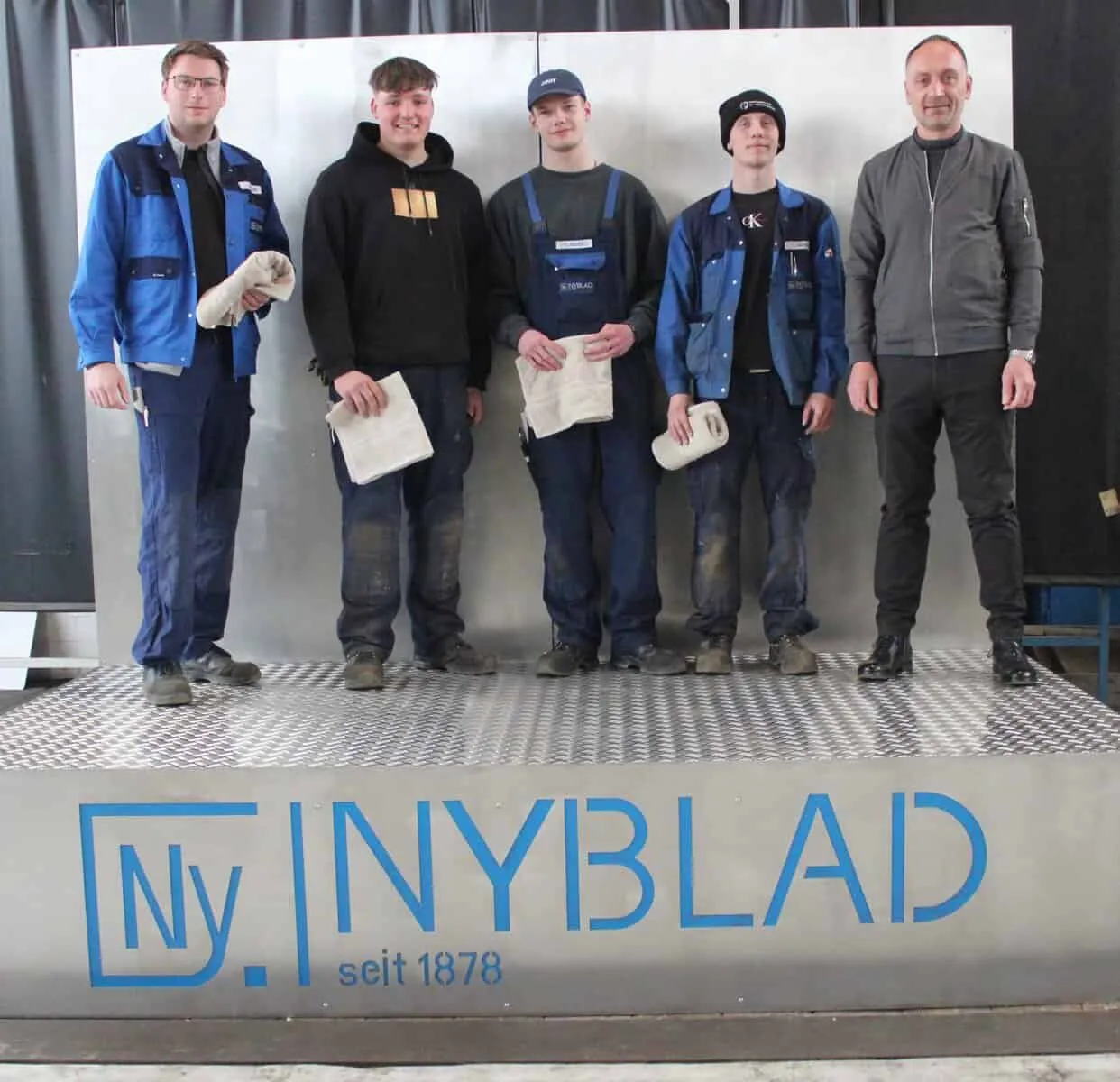 Neben der OLB-Stiftung als jahrelanger Hauptsponsor gehört auch die Papenburger Nyblad Maschinen- und Anlagenbau GmbH seit der 1. Auflage zu den Unterstützern dieser größten Papenburger Sportveranstaltung. Und auf Anfrage vom ehemaligen Nyblad-Mitarbeiter und scheidenden Chef-Organisator Peter Bergfeld (ganz rechts) war dann auch Senior-Chef Carl Josef Ehrlich schnell bereit, dass in die Jahre gekommene Siegerehrungspodest Marke Eigenbau durch einen professionellen und größeren Neubau zu ersetzen. Im Rahmen eines Ausbildungsprojekts unter der Leitung vom Ausbilder Jannes Pannenburg und den Auszubildenden Mika Koolenbrander, Tim Gerdes und Philipp Pieper (v.l.) entstand so eine neue, größere und zerlegbare Konstruktion aus Aluminium, die nun in den Werkshallen der Firma übergeben wurde und dann am 27.4. auf dem Papenburger Mühlenplatz erstmalig zum Einsatz kommt.